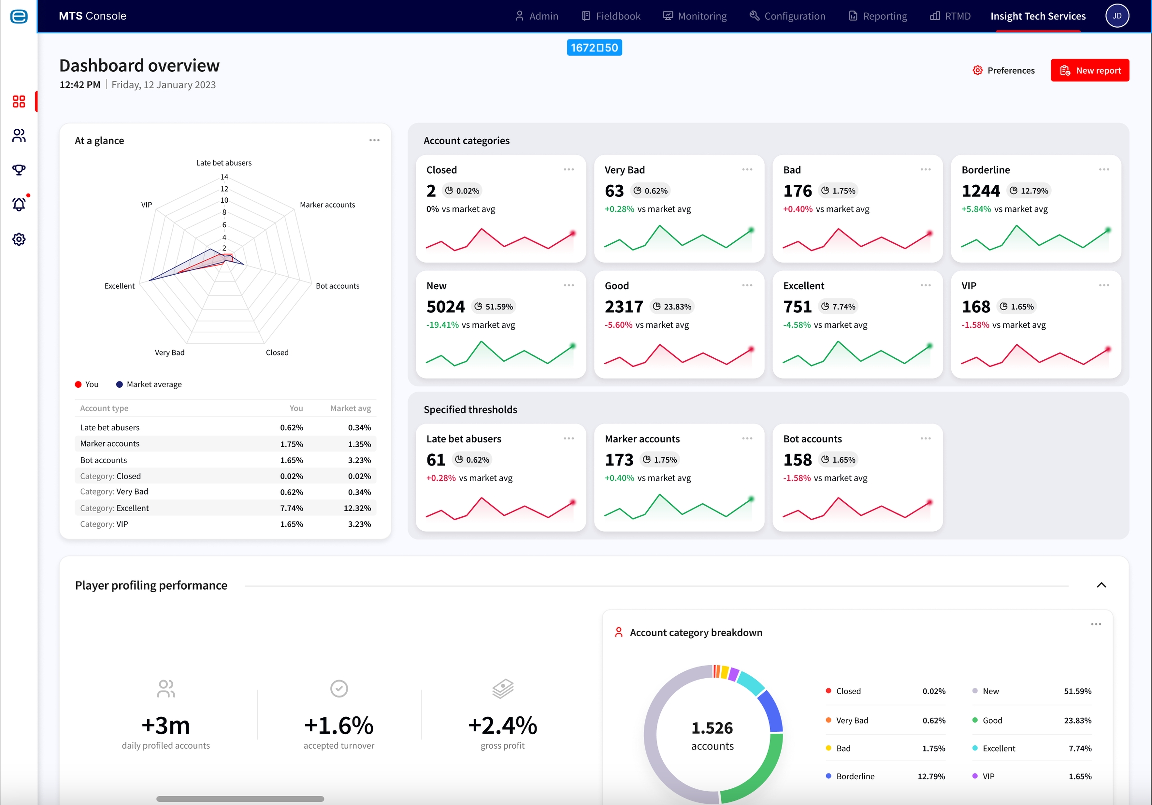 Account Categories: Grouped by Customer Confidence Factor (e.g., Closed, Bad, New, VIP) as well as behaviour-driven segments (e.g., Late Bets Abusers, Marker Accounts, Bot Accounts). This helps identify and prioritise user segments that require manual intervention or monitoring.